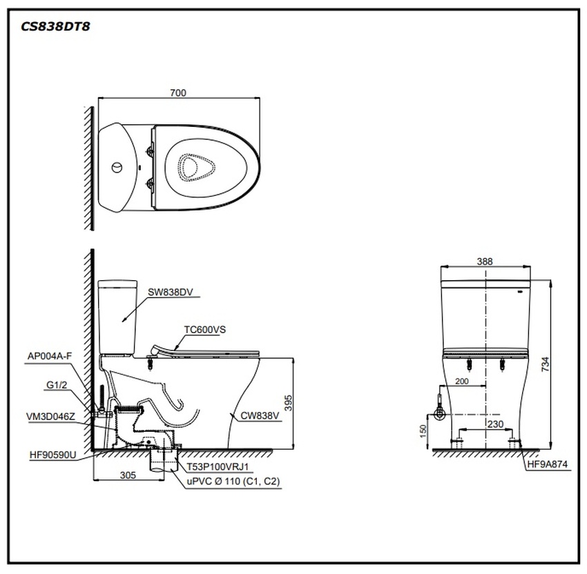 Khám phá bồn cầu 2 khối TOTO CS838DT8 nắp đóng êm TC600VS