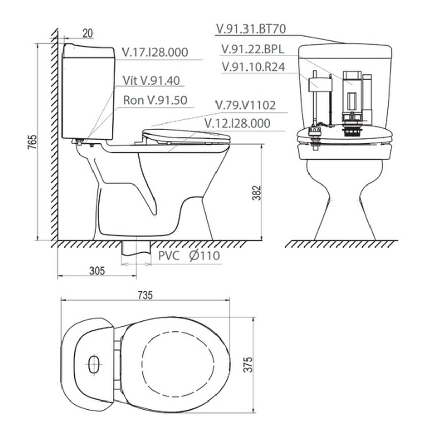- Thân cầu 2 khối dễ dàng lắp đặt và bảo trì.