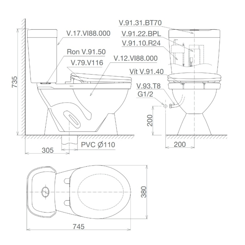 Bồn cầu 2 khối Viglacera VI88 nắp thường / nắp êm