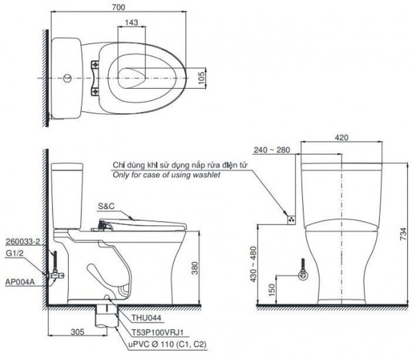 - Nắp điện tử Washlet S7: Các chức năng phun sương, sấy khô, sưởi ấm và khử mùi.