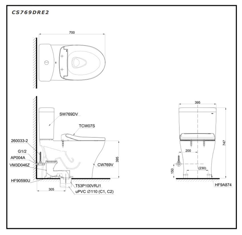 Bồn cầu TOTO CS769DRE2 2 khối nắp rửa cơ TCW07S – Sự tiện nghi vượt trội từ Hải Yến Home