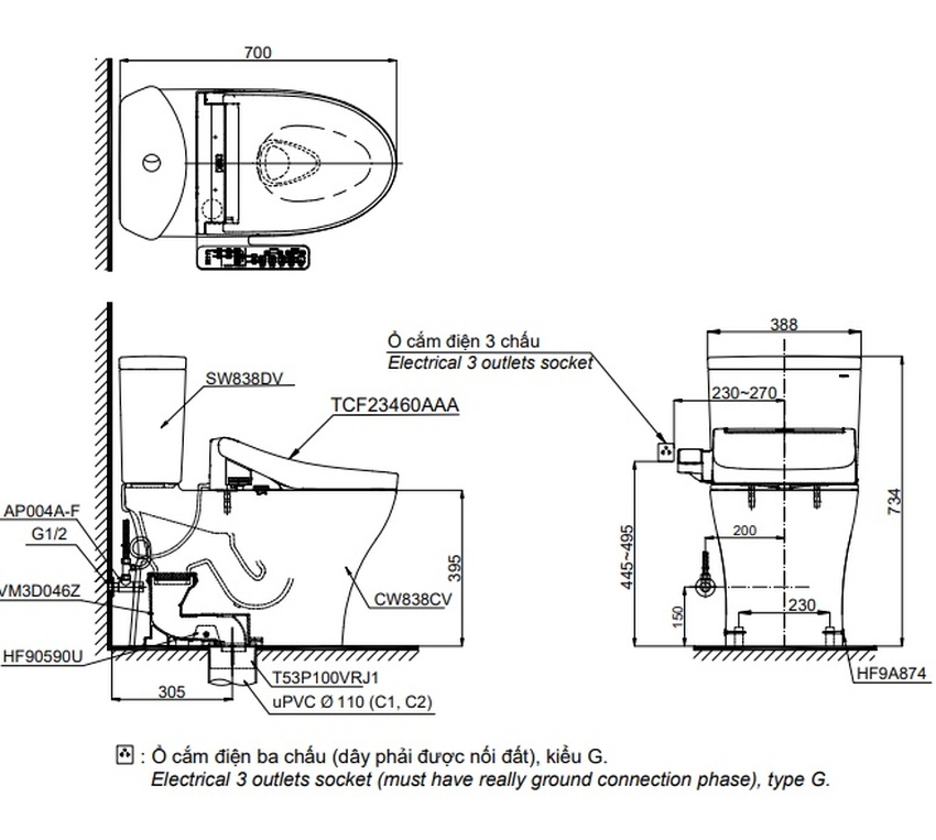 Khám phá bồn cầu TOTO CS838CDW17 2 khối; trang bị nắp điện tử Washlet C2 TCF23460AAA giấu dây, thiết kế hiện đại và tiện nghi cho phòng tắm của bạn!