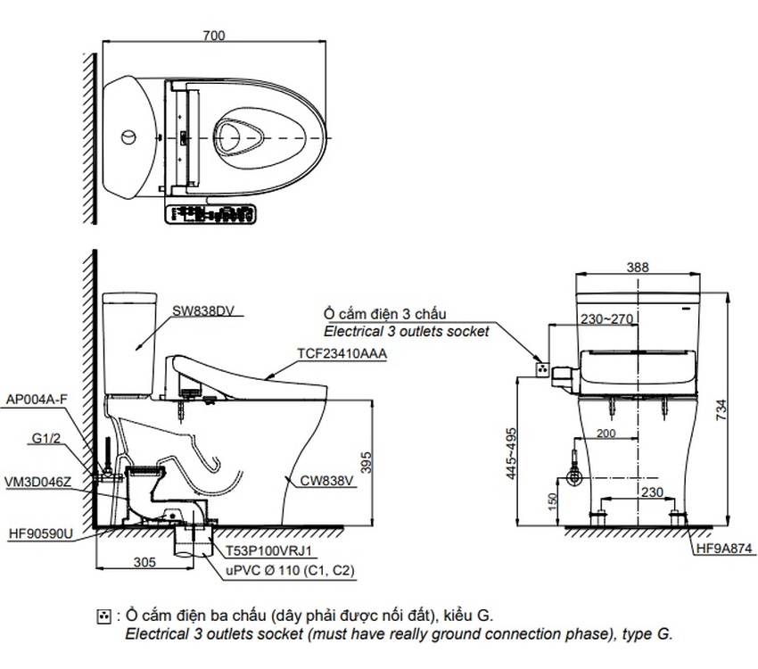 Bồn cầu TOTO CS838DW16 2 khối nắp điện tử Washlet C2 TCF23410AAA