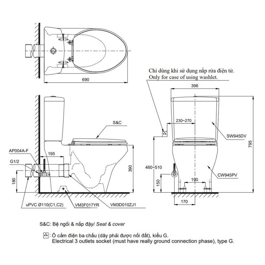 - Tích hợp nắp điện tử Washlet C5 với rửa tự động, sưởi ấm nắp, khử mùi.