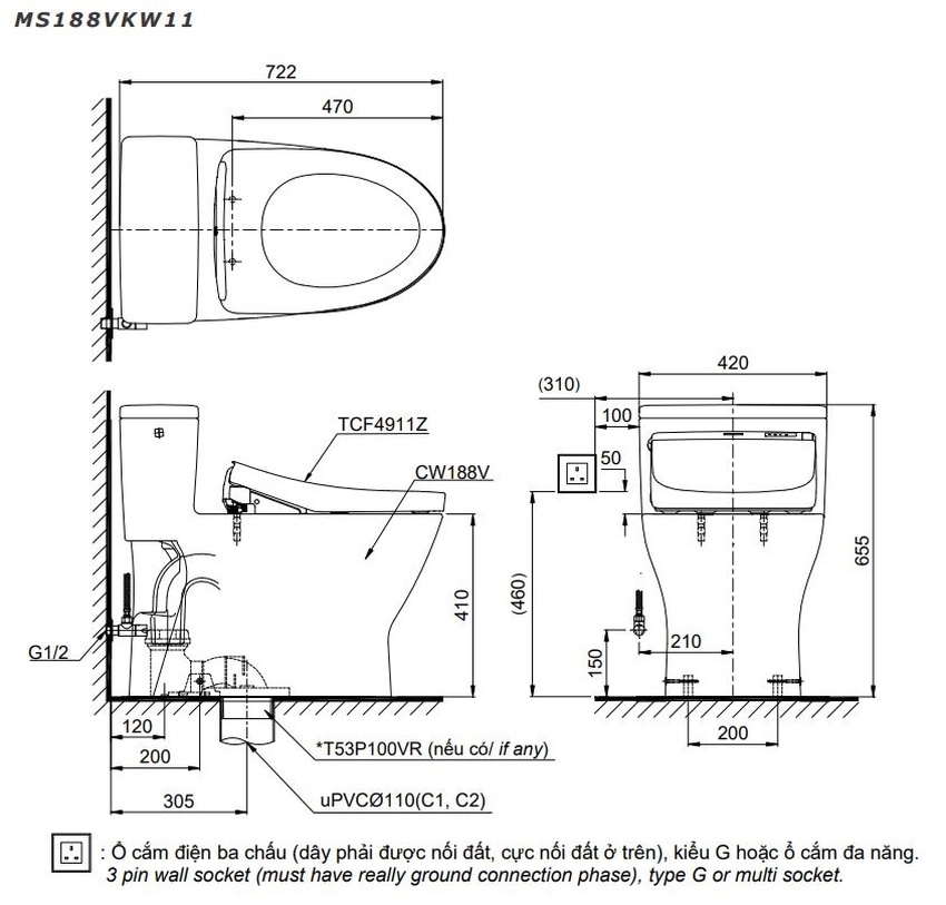 Bồn cầu TOTO MS188VKW11 T53P100VR: Sự Kết Hợp Hoàn Hảo Giữa Công Nghệ và Thiết Kế