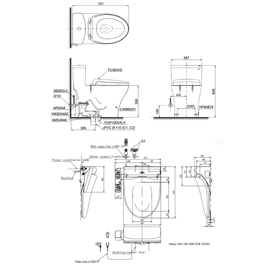 Bồn cầu TOTO MS885DW18 1 khối nắp điện tử Washlet C2 TCF23710AAA