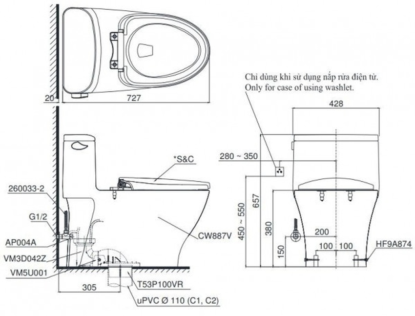 - Tích hợp nắp điện tử Washlet C5 với nhiều tính năng tiên tiến.