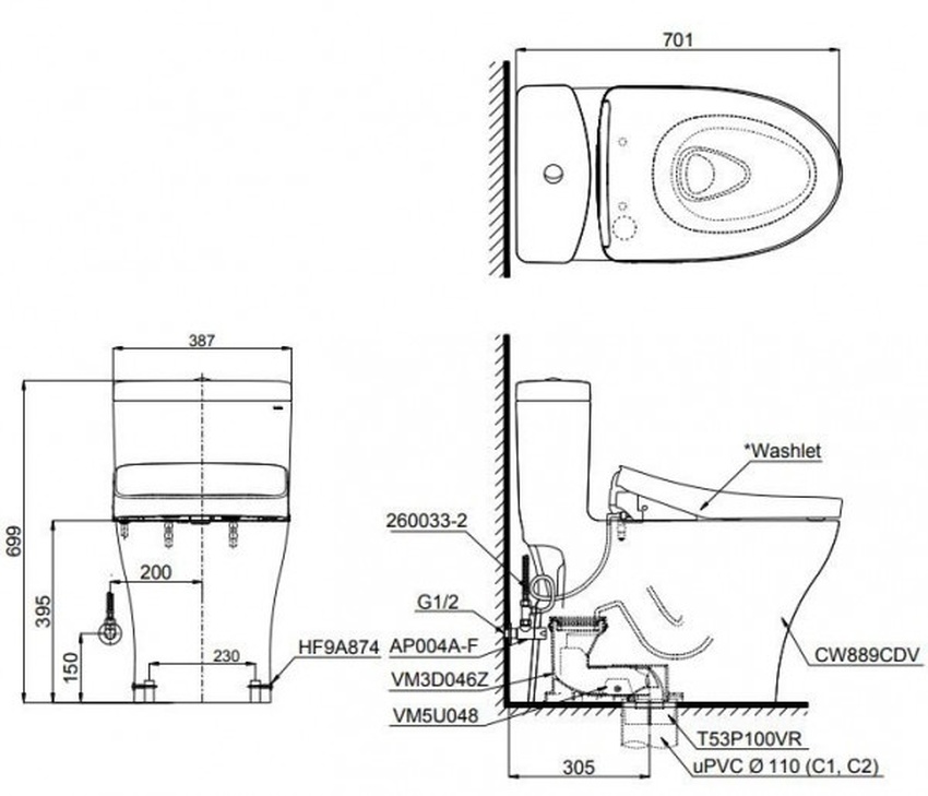 Bồn cầu TOTO MS889CDRW15 1 khối nắp điện tử Washlet C5 – Tích hợp công nghệ hiện đại