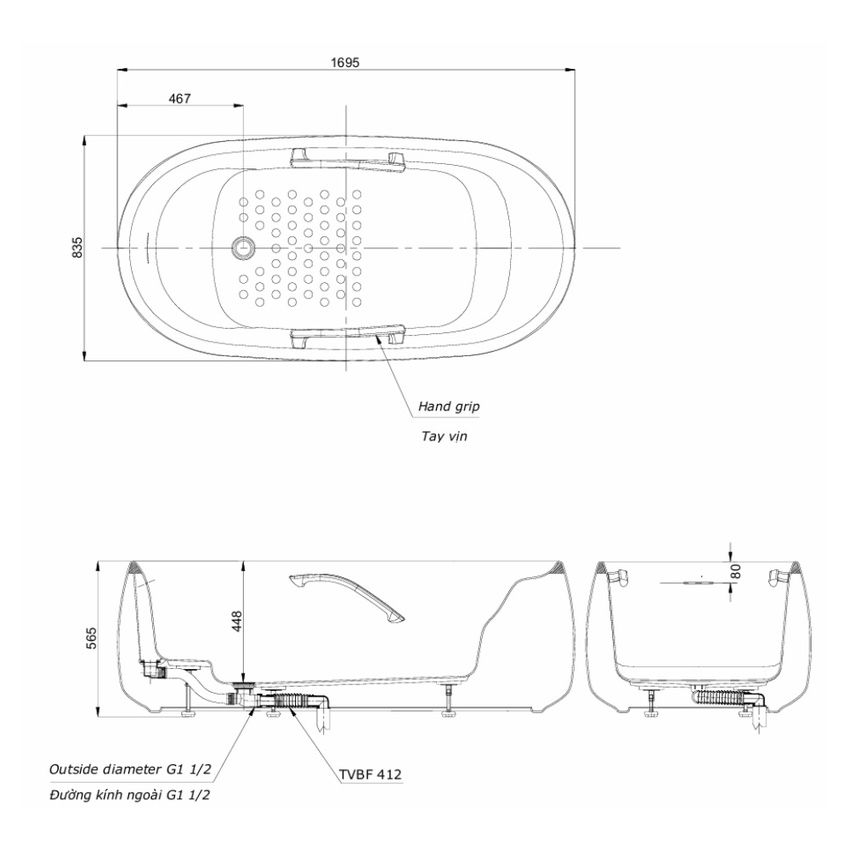- Dung tích lớn cho trải nghiệm tắm thoải mái.
