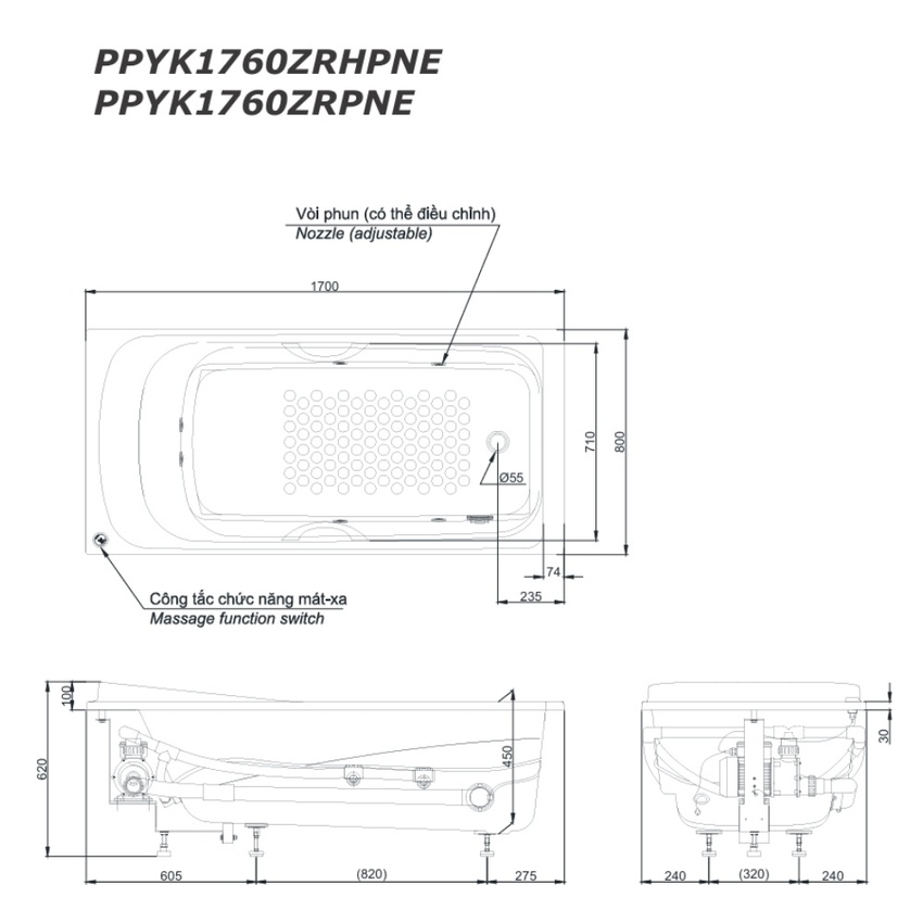 Bồn tắm massage TOTO PPYK1760ZRHPNE® TVBF412 DB505R-2B – Trải nghiệm thư giãn đẳng cấp