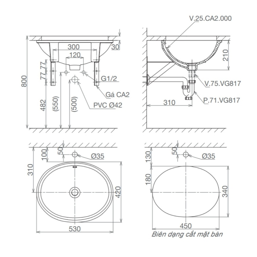 Chậu lavabo âm bàn Viglacera CA2