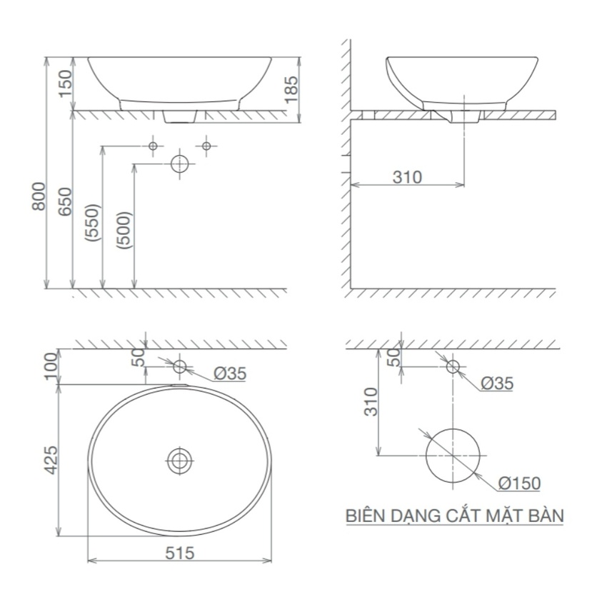 Thông số kỹ thuật của Chậu lavabo đặt bàn Viglacera BS415