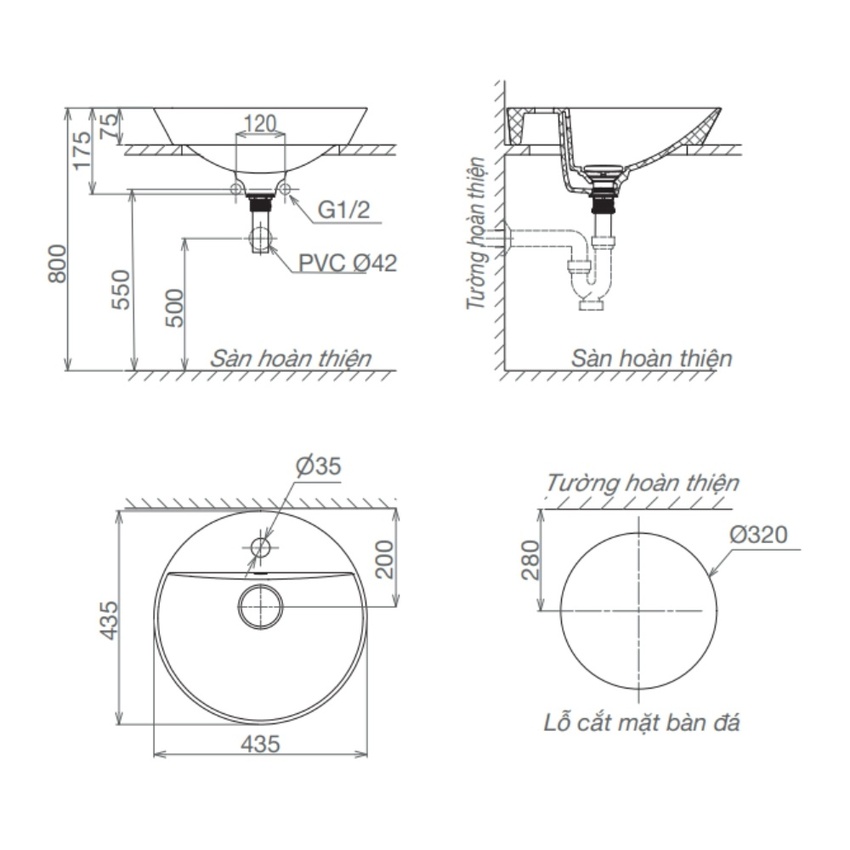 | Lỗ bắt vòi | 1 lỗ, Ø35 mm |