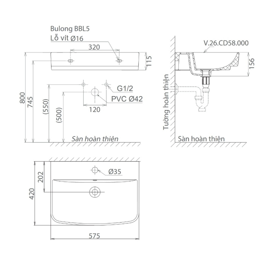 Mô Tả Chi Tiết Chậu Rửa Lavabo Treo Tường Viglacera V58
