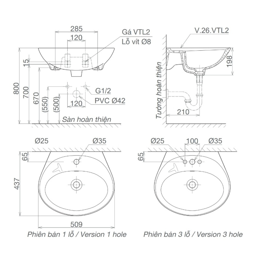 Chậu rửa lavabo treo tường Viglacera VTL2