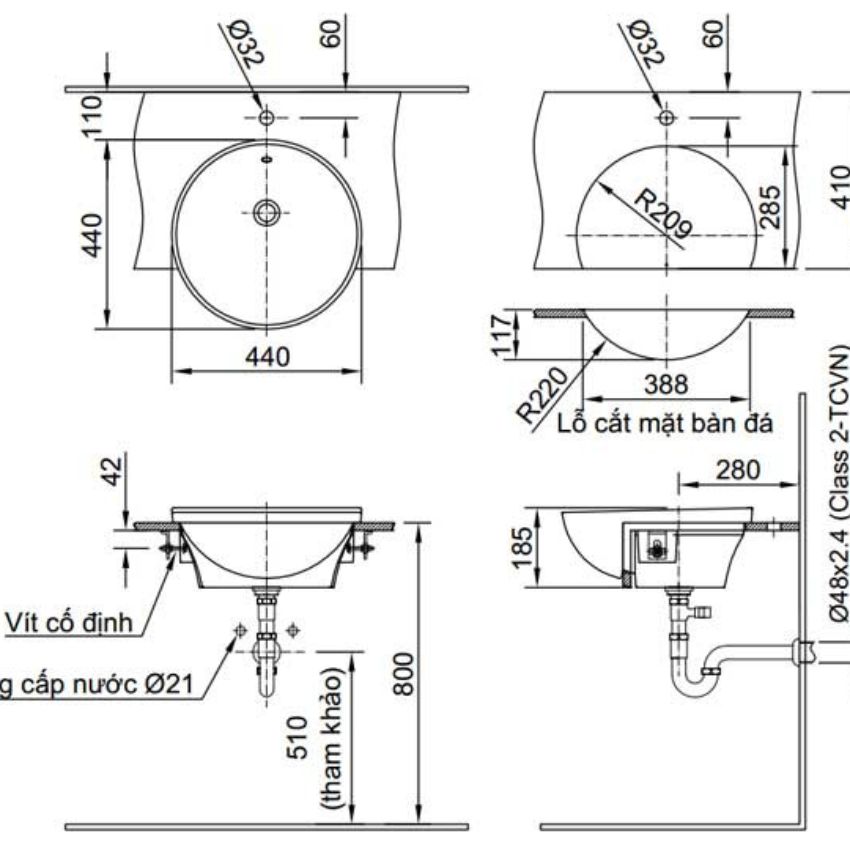 - Kích thước vừa phải: đường kính 440 mm phù hợp nhiều loại bàn đá lavabo.