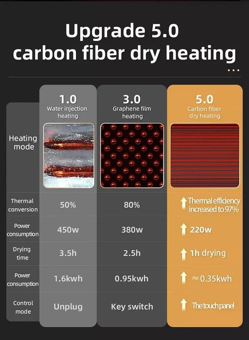 - Khả năng sấy khô nhanh chóng với sưởi ấm sợi Carbon.