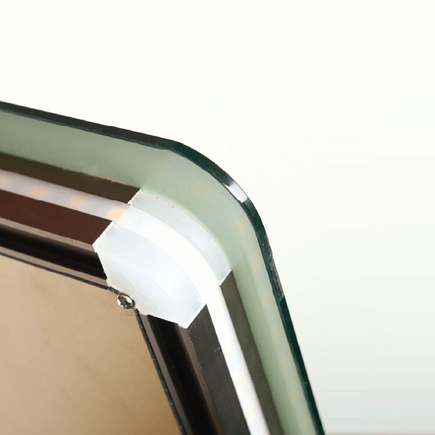 Điểm nhấn của sản phẩm là hệ thống đèn LED hắt viền với công suất 36 W, cho ánh sáng ba màu từ 2700K đến 6500K, dễ dàng điều chỉnh qua cảm ứng vẫy tay, giúp giữ cho bề mặt gương luôn sạch sẽ và sáng bóng. Với tiêu chuẩn chống nước IP67, gương thích hợp cho môi trường ẩm ướt như nhà tắm.