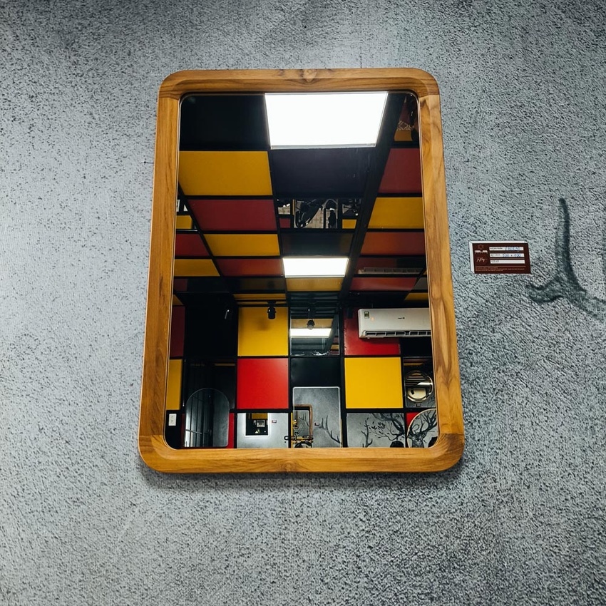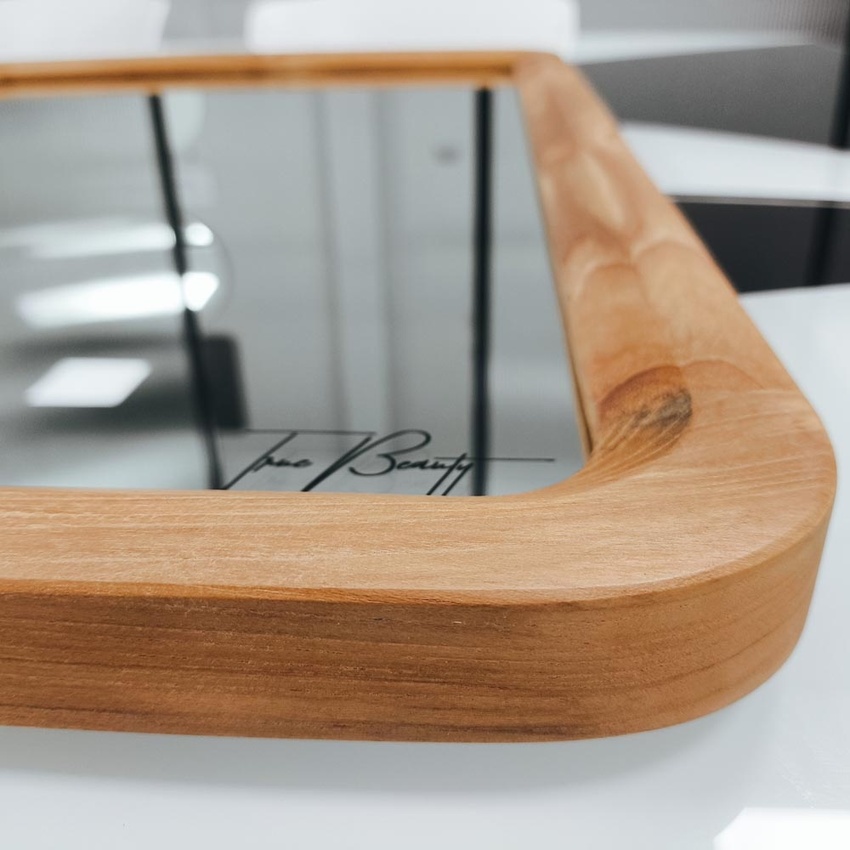 Khung viền gỗ tự nhiên là điểm nhấn đặc biệt, kết hợp với phôi gương cao cấp, tạo nên vẻ sang trọng và tinh tế. Gương được thiết kế với các đường cong và góc bo lượn mềm mại, đảm bảo sự hài hòa trong tổng thể.