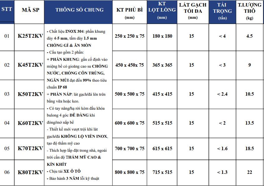 Sản phẩm được làm từ INOX 304 với phần khung dày 4-5 mm và tấm đậy 1.5 mm, đảm bảo khả năng chống gỉ và ăn mòn tuyệt vời. Phần khung được gắn cố định vào miệng bể với gioăng cao su giúp chống nước, chống côn trùng và ngăn mùi tối ưu đạt đến 99% theo tiêu chuẩn IP 68.
