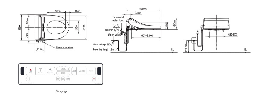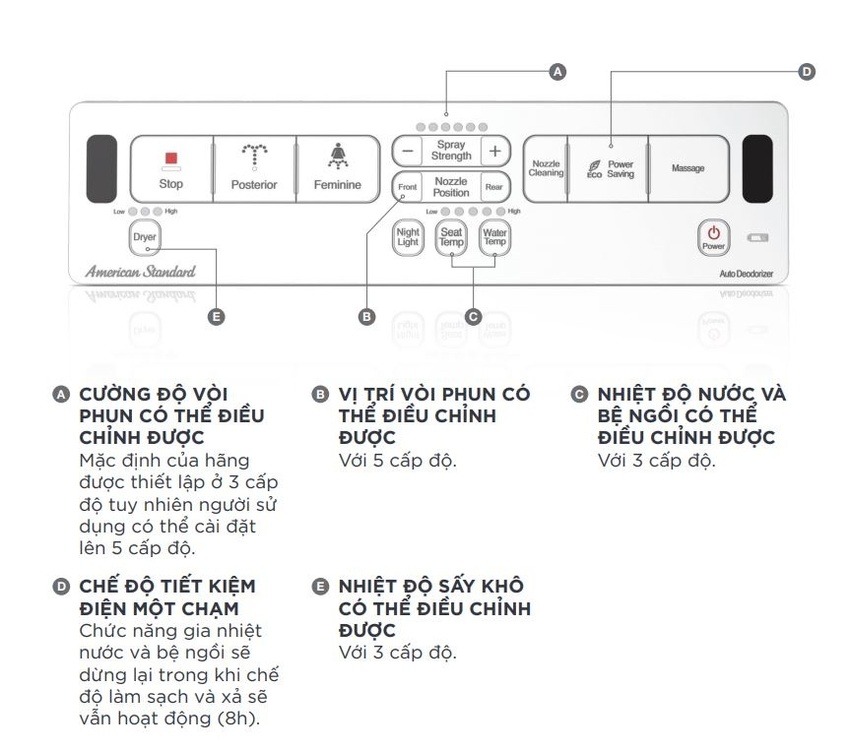 | Chức năng | Rửa trước và sau, sưởi ấm nắp ngồi, sấy khô, điều chỉnh nhiệt độ nước, chức năng sưởi ấm nước |