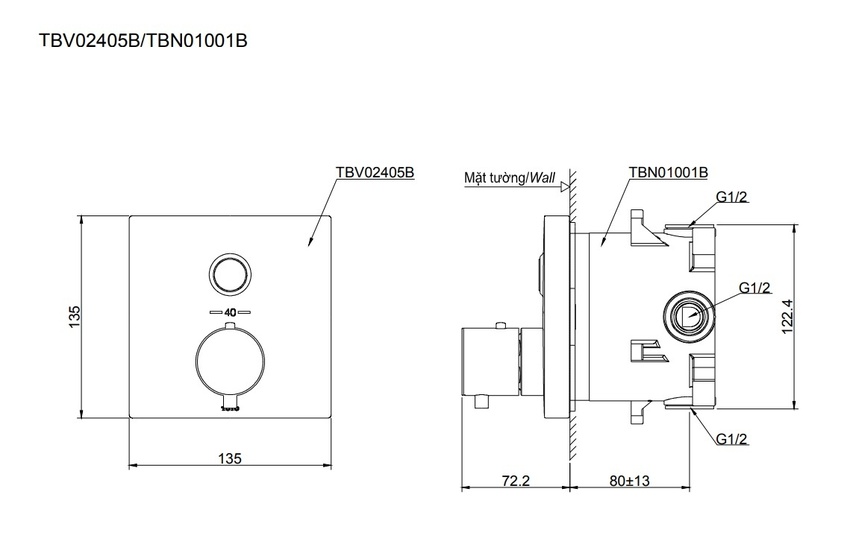Van điều chỉnh nhiệt độ kèm van dừng TOTO TBV02405B kèm phụ kiện âm tường TBN01001B