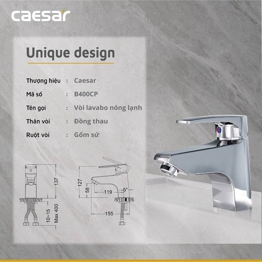 Vòi chậu lavabo nóng lạnh Caesar B400CU sở hữu thiết kế hiện đại với các đường nét tinh xảo, phù hợp với nhiều phong cách phòng tắm. Sản phẩm được làm từ chất liệu cao cấp, bền bỉ, chống gỉ sét và trầy xước, đảm bảo tuổi thọ lâu dài.