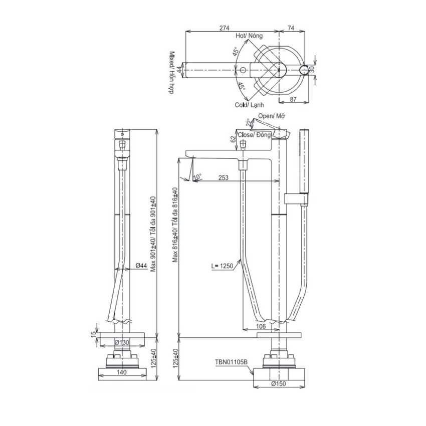 Vòi xả bồn tắm TOTO TBG13306A đặt sàn nóng lạnh