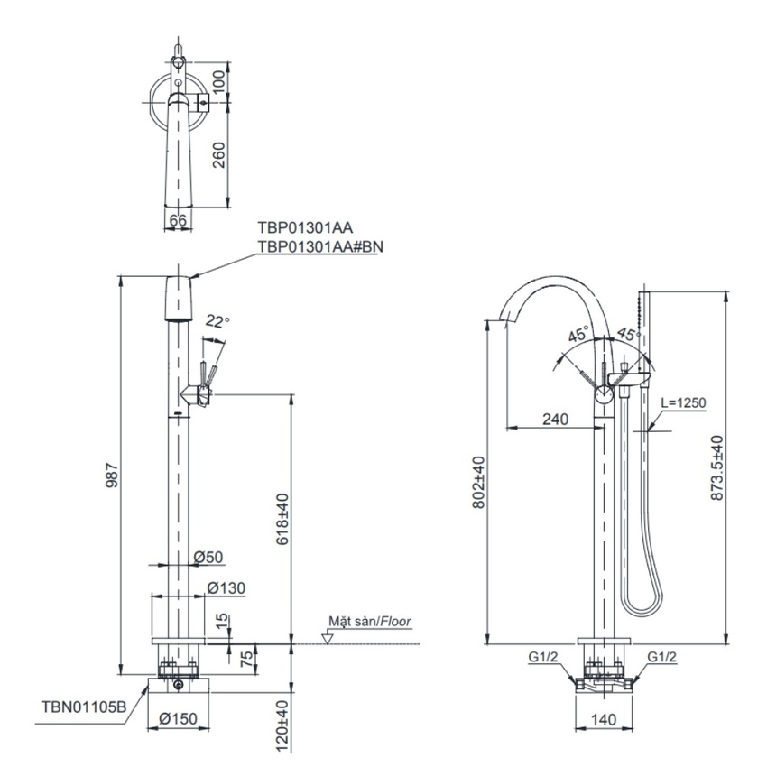 | Loại sản phẩm | Vòi xả bồn tắm đặt sàn |